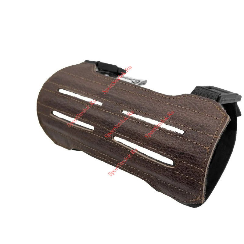 Крага изготовлена из натуральной высококачественной кожи. Внутренняя поверхность краги мягкая, что позволяет комфортно носить крагу на голой руке. Предусмотрены отверстия для вентиляции для ношения в помещениях и на улице в теплое время года. Крага дополнительно армирована гибкими пластиковыми ребрами жесткости, предотвращающими удар тетивой лука во время выстрела. Подходит для любого размера руки.